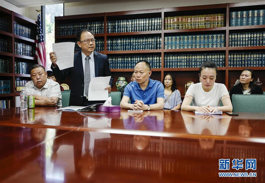 6月8日,在美國(guó)洛杉磯,江玥的家人和律師與媒體見(jiàn)面。新華社發(fā)(趙漢榮攝)