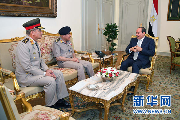 6月14日,在埃及首都開羅,埃及總統(tǒng)塞西(右一)和本屆內(nèi)閣新當(dāng)選成員國防部長(zhǎng)穆罕默德·扎基(左一)和前任國防部長(zhǎng)西德基·蘇卜希(左二)交談。新華社/中東社
