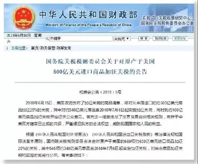 6月15日,美國政府不顧中美雙方達成的共識,發(fā)布對價值500億美元中國商品加征25%關(guān)稅的商品清單,嚴重侵犯和損害中國和中國人民的合法權(quán)益。隨后,中方依據(jù)相關(guān)法律發(fā)布公告,對原產(chǎn)于美國的659項約500億美元進口商品加征25%的關(guān)稅。2018-06-16 13:07:18