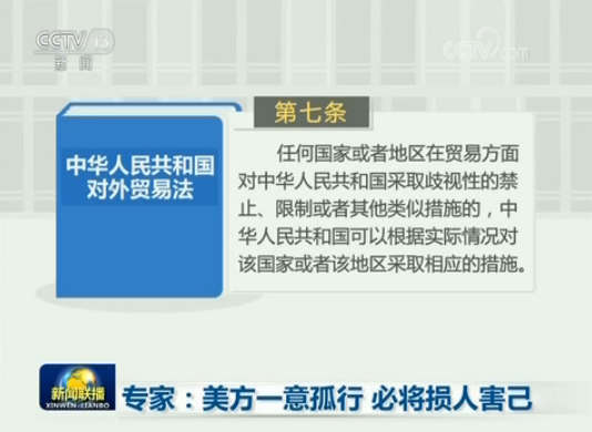 專家表示,中方采取的反制措施合理合法。根據(jù)《中華人民共和國對(duì)外貿(mào)易法》第七條,任何國家或者地區(qū)在貿(mào)易方面對(duì)中華人民共和國采取歧視性的禁止、限制或者其他類似措施的,中華人民共和國可以根據(jù)實(shí)際情況對(duì)該國家或者該地區(qū)采取相應(yīng)的措施。
