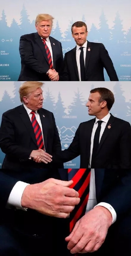 兩人在G7見面握手時(shí),馬克龍毫不客氣地把特朗普的手握出了白印子……