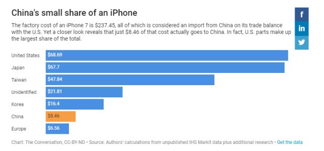 而這,便會令人以為美國在這個蘋果手機的貿(mào)易上對中國損失了240美元。那么如此計算的話,去年一年美國僅在iPhone7和iPhone7 Plus這兩款蘋果手機上就與中國有了157億美元的“貿(mào)易逆差”。