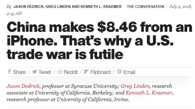 可實際上,按照三位美國學(xué)者的說法,這上百億的貿(mào)易逆差中的最主要部分,卻根本不是被中國人賺走的,反而是進入了美國蘋果公司以及日本一些高科技企業(yè)的腰包。而中國真正從一臺iPhone上賺取的,只有區(qū)區(qū)8.46美元,即整個出廠價的3.6%!
