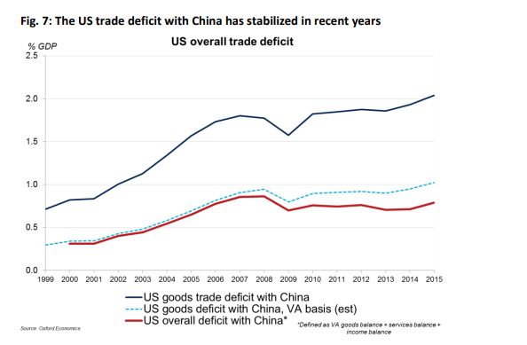 別看這個歐洲智庫的數(shù)據(jù)有點舊,在2018年的今天,情況還是一樣一樣的。美國CNBC上個月的一篇報道中就引用了來自牛津大學(xué)的數(shù)據(jù)稱,如果按照各國實際在貿(mào)易中的“附加價值”計算,中美現(xiàn)在3700億的貿(mào)易逆差會縮小一半之巨,即從美國GDP的2%縮小到1%——這已經(jīng)與歐盟相當(dāng)了。