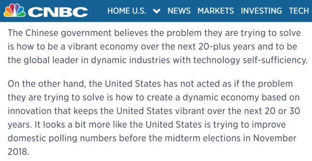 特朗普真正在意的問題,并不是創(chuàng)造一個活躍創(chuàng)新的經(jīng)濟,好讓美國在未來20-30年繼續(xù)保持領(lǐng)先,他在乎的只是11月中期選舉的投票數(shù)字;另一方面,中國政府在意的問題,反倒是如何令其經(jīng)濟在接下來的20年里保持活力,從而令中國成為一個引領(lǐng)世界、科技上自主獨立的國家。