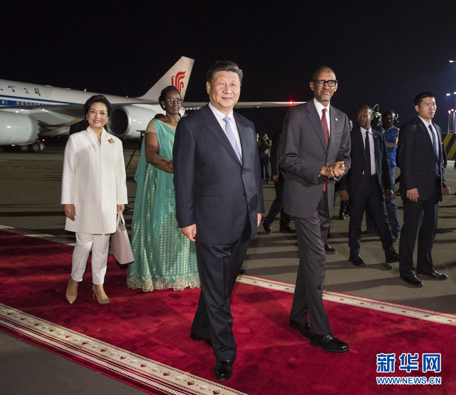 習近平是在結束對塞內(nèi)加爾國事訪問后抵達基加利的。離開達喀爾時,習近平出席塞內(nèi)加爾總統(tǒng)薩勒在機場舉行的歡送儀式。習近平和彭麗媛抵達機場時,薩勒和夫人瑪麗梅在停車處迎接。兩國元首夫婦一同前往停機坪。兩國元首登上檢閱臺。軍樂隊奏中塞兩國國歌。習近平在薩勒陪同下檢閱儀仗隊。習近平和彭麗媛同塞方送行人員道別。薩勒夫婦同中方陪同人員道別。