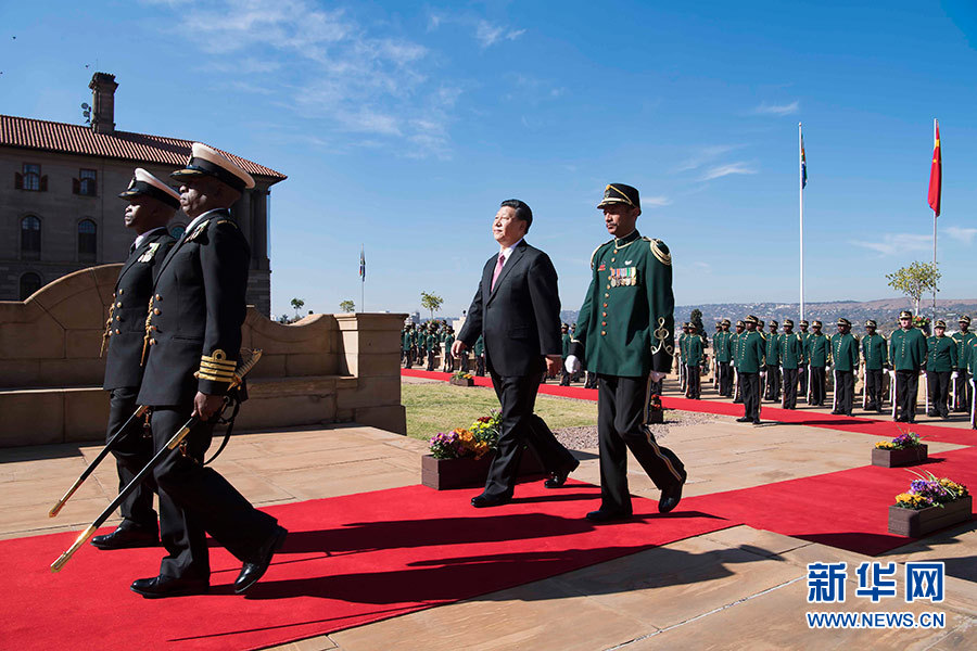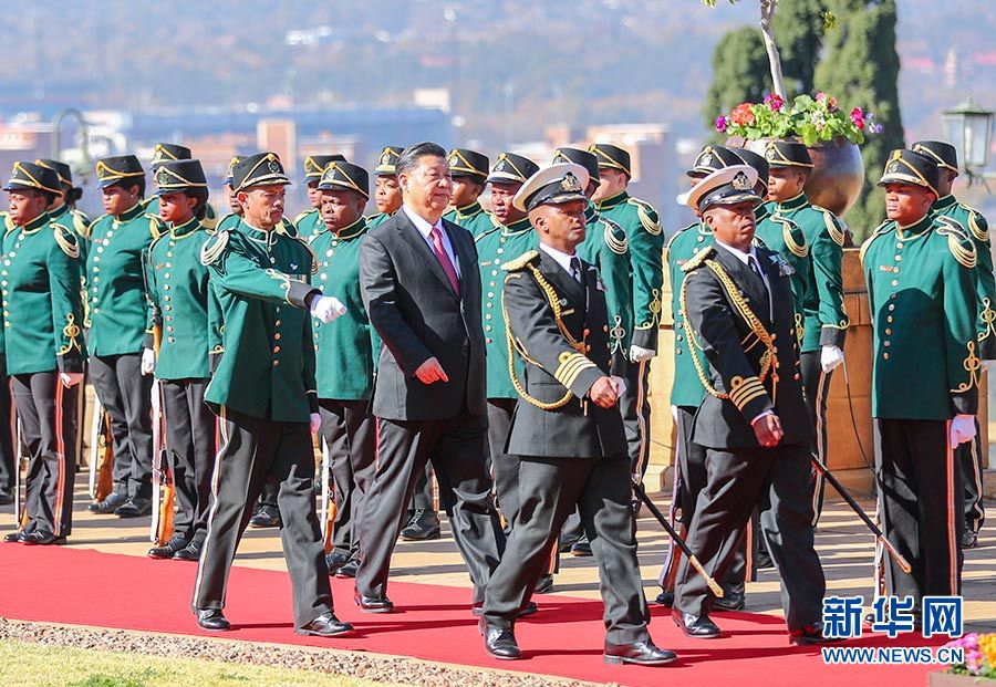總統(tǒng)府前廣場,微風(fēng)拂面,陽光和煦。中南兩國國旗迎風(fēng)飄揚。習(xí)近平和夫人彭麗媛受到拉馬福薩和夫人莫采佩熱情迎接。兩國元首夫婦登上檢閱臺。儀仗隊行持槍禮。軍樂隊奏中國國歌?,F(xiàn)場鳴放21響禮炮。習(xí)近平檢閱儀仗隊。軍樂隊奏南非國歌。習(xí)近平和彭麗媛同南方主要官員握手。拉馬福薩夫婦同中方陪同人員握手。兩國元首夫婦親切寒暄。拉馬福薩對習(xí)近平在南中建交20周年之際訪問南非并出席金磚國家領(lǐng)導(dǎo)人會晤表示熱烈歡迎。