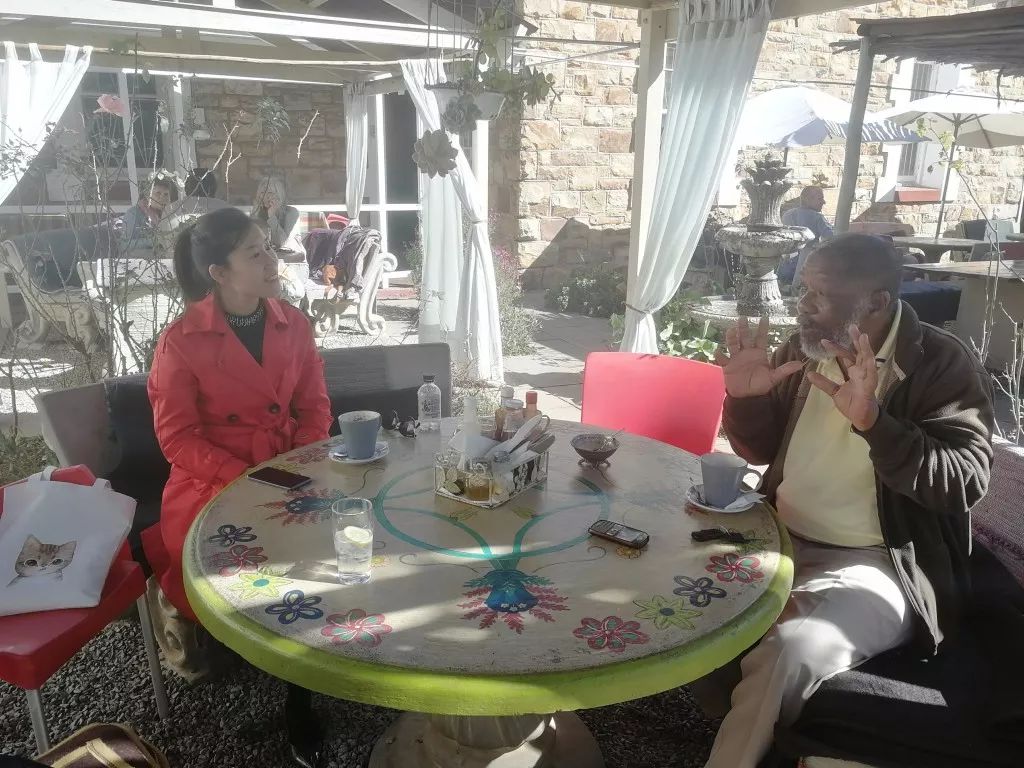 幾天的走訪過程中,比勒陀利亞市民對中國人的友好也給我們留下了深刻印象。走在街上,不時會有擦肩而過的當?shù)厝酥鲃酉蛭覀兇蛘泻簦弥形恼f著“你好!”照片中偶遇的這位當?shù)卮笫褰蠱agano。沒想到這位大叔還是位時事通,和我們聊起中國、金磚國家的時候,他顯得興致勃勃,不時做著手掌交叉、一拍即合的手勢。