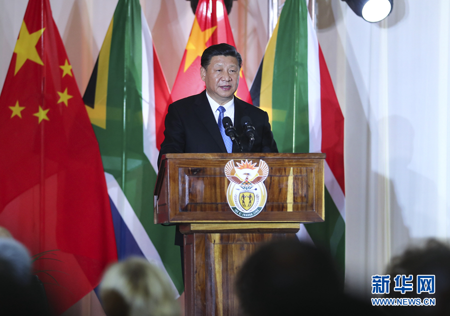 7月24日,國(guó)家主席習(xí)近平在比勒陀利亞出席南非總統(tǒng)拉馬福薩舉行的歡迎習(xí)近平主席對(duì)南非進(jìn)行國(guó)事訪(fǎng)問(wèn)暨慶祝中南建交20周年晚宴。這是習(xí)近平發(fā)表致辭。新華社記者 謝環(huán)馳 攝