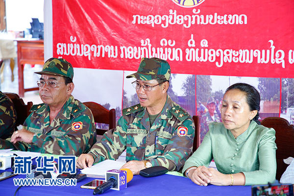 7月28日,老撾人民軍總參謀部副總參謀長、潰壩事故救援總指揮坎良·烏塔凱山(中)在災區(qū)薩南賽縣舉行的救援情況發(fā)布會上說,截至當晚,潰壩事故的救援力量共發(fā)現(xiàn)8具遇難者遺體,仍有123人生死不明。新華社發(fā)