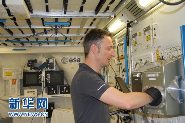 7月18日,在德國科隆,德國宇航員馬天(馬蒂亞斯·毛雷爾)在歐洲航天局哥倫布實驗艙的模擬艙內展示實驗操作。 新華社記者張毅榮攝