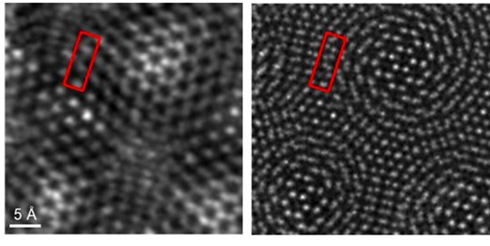 這是領(lǐng)先于過(guò)去成像方法的一個(gè)重要步驟,以前看不清是因?yàn)樘綔y(cè)器只收集了一部分散射的電子。此前,在同樣的低電壓情況下,得到的空間分辨率一般小于0.1納米。兩張圖相比,一個(gè)線條模糊,一個(gè)能看得顆粒分明。