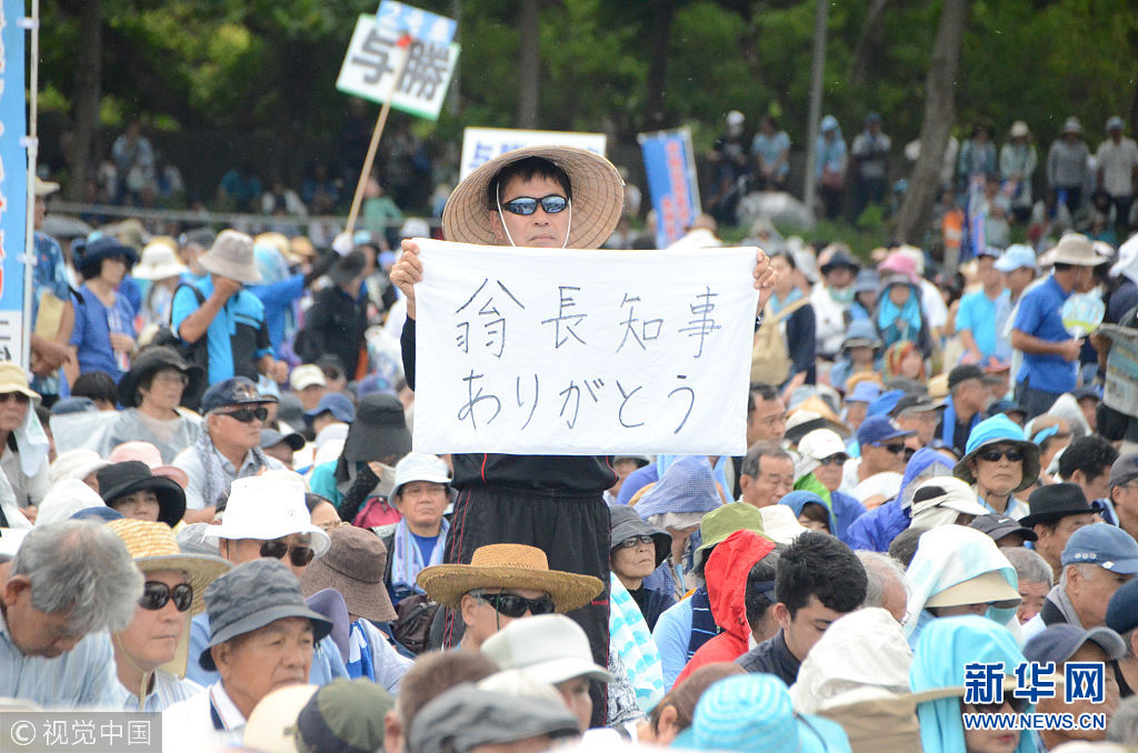 當?shù)貢r間2018年8月11日,日本沖繩縣約7萬民眾8月11日在那霸市舉行大規(guī)模集會,反對駐日美軍將普天間基地遷往名護市邊野古地區(qū),要求駐日美軍放棄在邊野古地區(qū)新建基地并立即關(guān)閉普天間機場。當天,日本東京都、大阪府、福岡、北海道縣等地民眾也同時舉行集會和游行,抗議日本政府推進邊野古地區(qū)填海施工。(圖片來源:視覺中國)