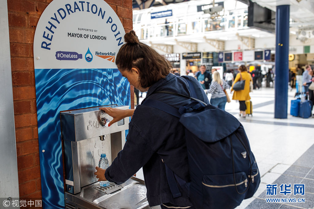 當(dāng)?shù)貢r(shí)間2018年8月28日,英國(guó)倫敦,民眾在公共飲水機(jī)旁飲水。倫敦市長(zhǎng)近日引進(jìn)了20個(gè)新的公共飲水機(jī),鼓勵(lì)人們自帶杯子取水喝,從而減少塑料垃圾。 (圖片來源:視覺中國(guó))
