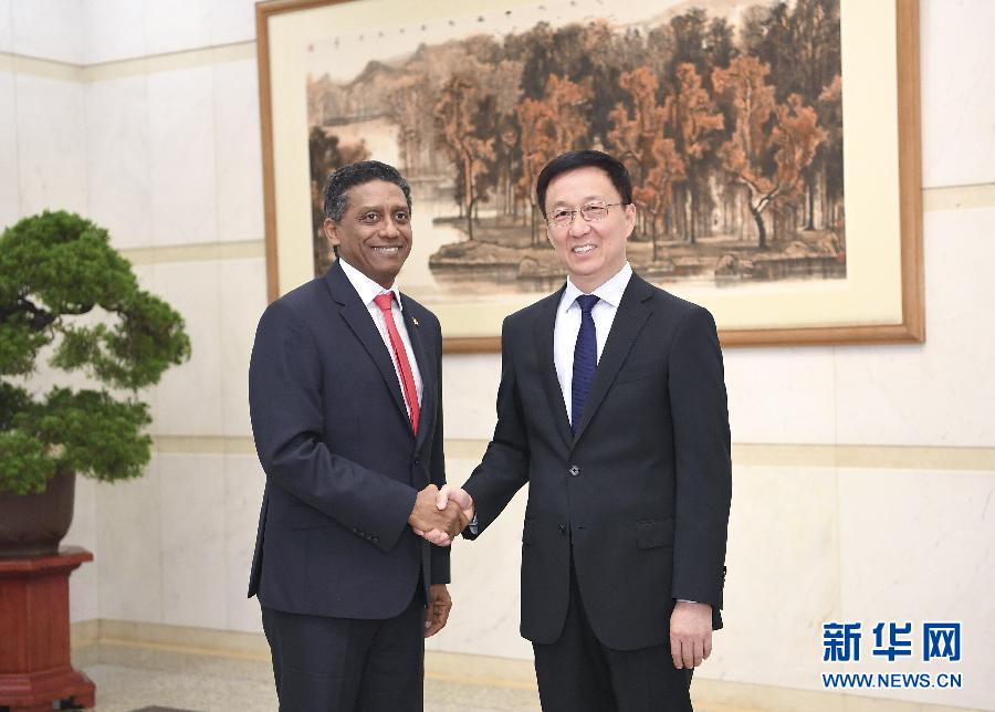 9月1日,國(guó)務(wù)院副總理韓正在北京釣魚臺(tái)國(guó)賓館會(huì)見塞舌爾總統(tǒng)富爾。 新華社記者 燕雁 攝