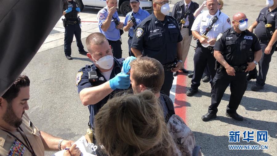 9月5日,在美國(guó)紐約肯尼迪機(jī)場(chǎng),警察為阿聯(lián)酋航空公司EK203航班上的乘客查體溫。新華社發(fā)