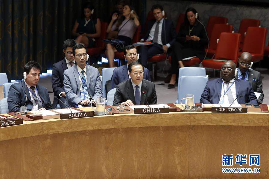 9月6日,在位于紐約的聯(lián)合國(guó)總部,中國(guó)常駐聯(lián)合國(guó)代表馬朝旭(前中)在安理會(huì)敘利亞化武問(wèn)題公開(kāi)會(huì)上發(fā)表講話。新華社記者李木子 攝