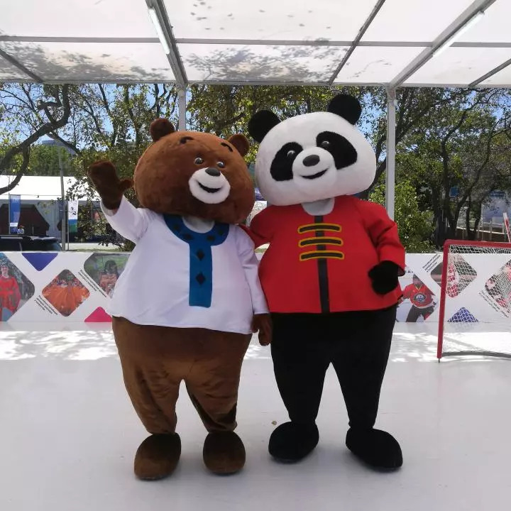 第四屆東方經(jīng)濟(jì)論壇配套展示項(xiàng)目遠(yuǎn)東風(fēng)采街上,可愛的“中國熊貓”和“俄羅斯棕熊”一起打冰球(新華社記者蔣國鵬攝)