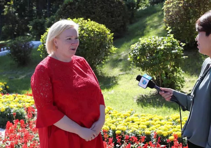 勘察加邊疆區(qū)旅游和對(duì)外聯(lián)絡(luò)局局長葉連娜·斯特拉托諾娃接受新華社記者采訪(新華社記者李建敏攝)