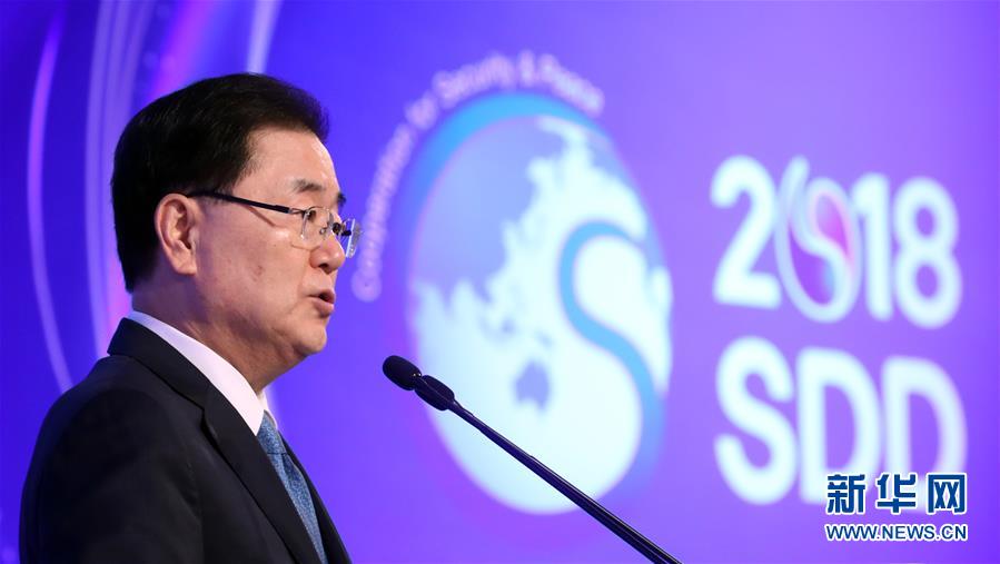 9月13日,在韓國首爾,韓國總統(tǒng)府青瓦臺國家安保室室長鄭義溶在“2018年首爾安保對話”開幕式上致辭。韓國總統(tǒng)府青瓦臺國家安保室室長鄭義溶13日表示,為從根本上消除可能導致韓朝雙方軍事沖突的危險因素,提升軍事互信水平,韓朝正就在軍事領域開展廣泛合作進行協(xié)商并制定方案。 新華社/紐西斯通訊社