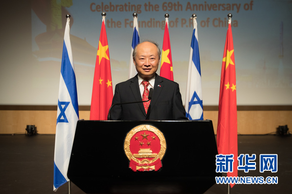 中國駐以色列大使詹永新在國慶招待會(huì)上致辭。新華社記者郭昱 攝