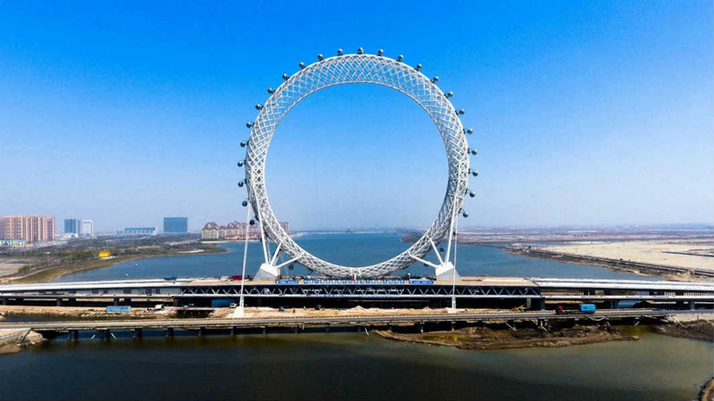 “渤海之眼”摩天輪由一個外層外形支承桁架組成。這個環(huán)形架由4600噸鋼梁建成,花兩年時間建造。有別于傳統(tǒng)的有軸摩天輪,渤海之眼摩天輪中間沒有任何支撐,運行時輪盤不轉(zhuǎn)動,轎廂自帶行走機構,通過軌道沿輪盤轉(zhuǎn)動。