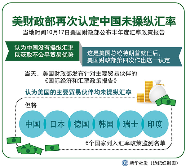 新華社華盛頓10月17日電(記者楊承霖 高攀)美國(guó)財(cái)政部17日公布半年度匯率政策報(bào)告,認(rèn)為中國(guó)沒(méi)有操縱匯率以獲取不公平貿(mào)易優(yōu)勢(shì)。這是美國(guó)總統(tǒng)特朗普就任后,美國(guó)財(cái)政部第四次作出這一認(rèn)定。