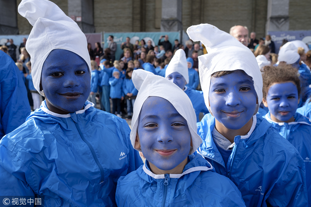 當?shù)貢r間2018年10月23日,比利時布魯塞爾,民眾參加動畫形象“藍精靈”60歲慶?;顒印#▓D片來源:視覺中國)