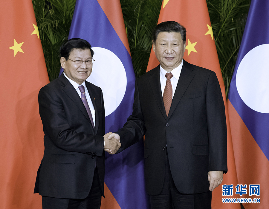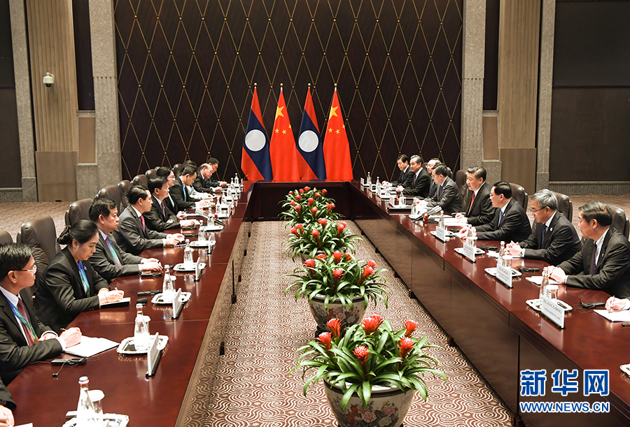 11月4日,國家主席習(xí)近平在上海會見老撾總理通倫。 新華社記者 饒愛民 攝