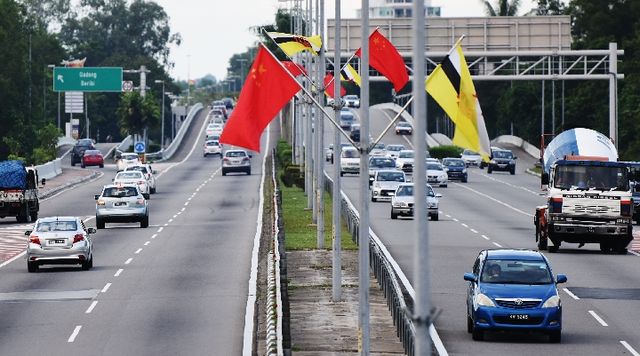 13日,當(dāng)?shù)刈畲笥⑽膱蠹垺镀帕_洲公報》在頭版顯著位置刊發(fā)了習(xí)主席即將來訪的消息。為迎接中國國家元首時隔13年再次到訪,從斯里巴加灣機場到文萊蘇丹哈桑納爾居住的努洛伊曼王宮的馬路上,早早掛起了鮮艷的五星紅旗。
