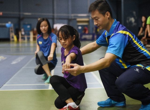 文萊國家武術(shù)隊教練李輝(右)在指導(dǎo)文萊學(xué)生武術(shù)動作。新華社記者王申攝