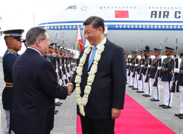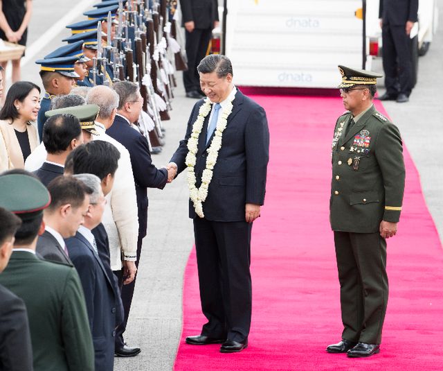 11月20日,國家主席習近平抵達馬尼拉,開始對菲律賓共和國進行國事訪問。這是習近平在機場受到菲律賓政府高級官員熱情迎接。新華社記者黃敬文攝