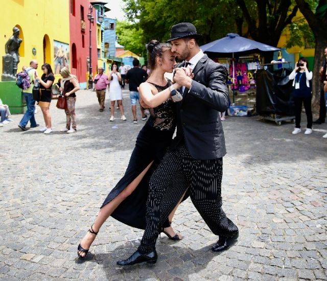 在布宜諾斯艾利斯市博卡區(qū),一對(duì)舞者當(dāng)街跳起探戈。(新華社記者姚大偉攝)
