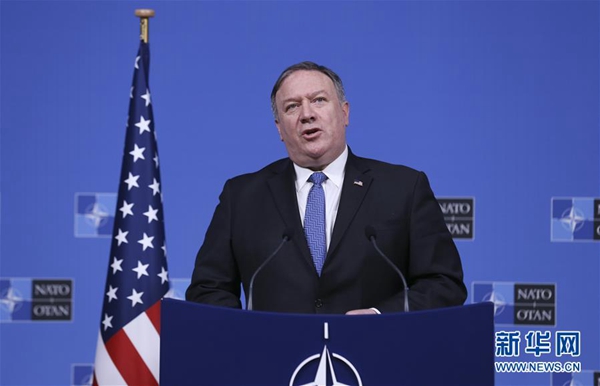 12月4日,在比利時布魯塞爾,美國國務卿蓬佩奧出席新聞發(fā)布會。 新華社記者 葉平凡 攝