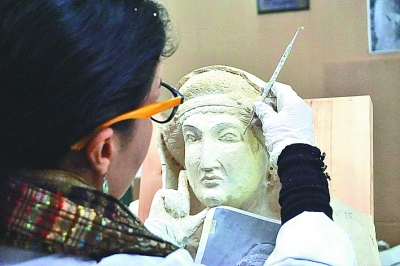 12月5日,在敘利亞首都大馬士革,文物修復師赫芭·朱馬在國家博物館內修復來自巴爾米拉的受損雕像。新華社發(fā)