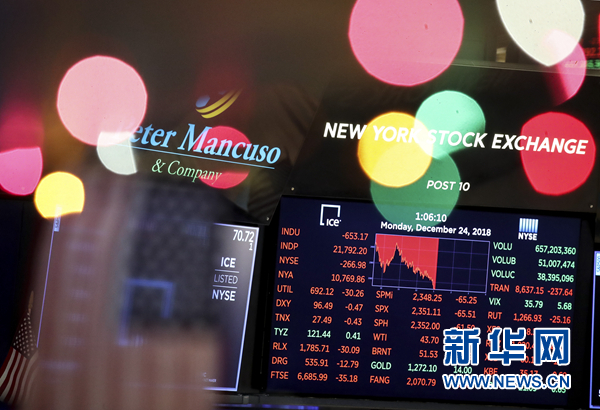 12月24日,美國紐約證券交易所的電子屏顯示當日交易信息。 紐約股市三大股指24日收盤下跌。截至當天收盤,道瓊斯工業(yè)平均指數(shù)比前一交易日下跌653.17點,收于21792.20點,跌幅為2.91%。標準普爾500種股票指數(shù)下跌65.52點,收于2351.10點,跌幅為2.71%。納斯達克綜合指數(shù)下跌140.08點,收于6192.92點,跌幅為2.21%。 新華社記者 王迎 攝