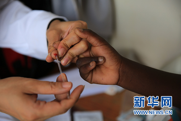 這張2018年12月8日拍攝的照片顯示,在馬拉維南部布蘭太爾市卡迪迪村衛(wèi)生院,第六批中國援馬拉維醫(yī)療隊(duì)醫(yī)生在義診活動(dòng)中為當(dāng)?shù)鼐用駲z測瘧疾。新華社發(fā)(樊江波 攝)