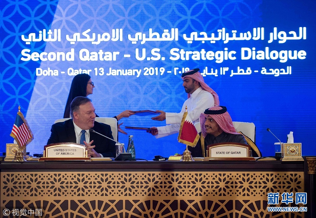 2019年1月13日,卡塔爾多哈,美國(guó)國(guó)務(wù)卿邁克·蓬佩奧訪問卡塔爾。蓬佩奧與卡塔爾副首相兼外交大臣穆罕默德在多哈的喜來(lái)登大酒店簽署了諒解備忘錄和意向聲明并舉行聯(lián)合記者會(huì)。蓬佩奧表示,兩國(guó)外交部門領(lǐng)導(dǎo)人當(dāng)天簽署了一份諒解備忘錄,將擴(kuò)建和改造烏代德美國(guó)空軍基地。(圖片來(lái)源:視覺中國(guó))