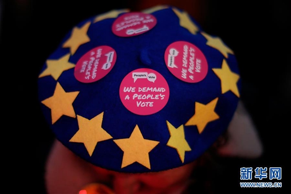 1月15日,在英國倫敦,一名戴著帽子的反對英國“脫歐”示威者在議會大廈外參加集會。 新華社發(fā)(蒂姆·愛爾蘭攝)