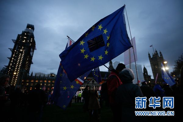 1月15日,在英國(guó)倫敦,反對(duì)英國(guó)“脫歐”示威者在議會(huì)大廈外參加集會(huì)。新華社發(fā)(蒂姆·愛(ài)爾蘭攝)