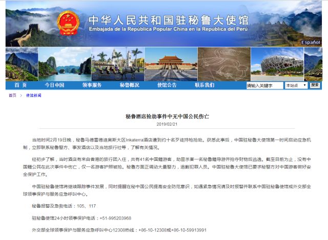 當(dāng)?shù)貢r(shí)間2月19日晚,秘魯馬德雷德迪奧斯大區(qū)Inkaterra酒店遭到約十名歹徒持槍搶劫。獲悉此事后,中國駐秘魯大使館第一時(shí)間啟動應(yīng)急機(jī)制,立即聯(lián)系秘魯警方、事發(fā)酒店以及當(dāng)?shù)芈眯猩绲?,了解有關(guān)情況。