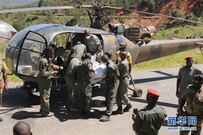 3月21日,在津巴布韋馬尼卡蘭省奇馬尼馬尼,一架軍方直升機轉(zhuǎn)運遇難者遺體。新華社發(fā)(肖恩·朱薩 攝)