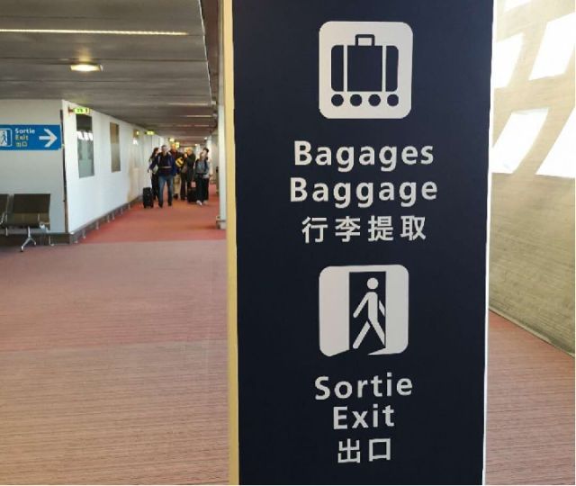 戴高樂國(guó)際機(jī)場(chǎng)內(nèi)的中文提示語(yǔ)。新華社記者 孫浩 攝