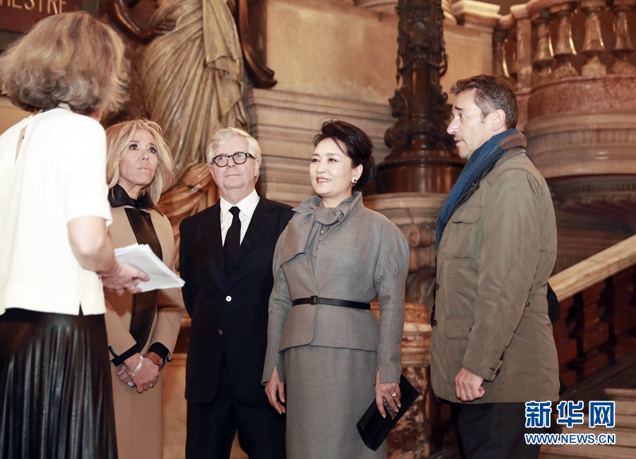 3月25日,國家主席習(xí)近平夫人彭麗媛在法國總統(tǒng)夫人布麗吉特陪同下參觀位于巴黎市第九區(qū)的法國巴黎歌劇院。 新華社記者 丁林 攝
