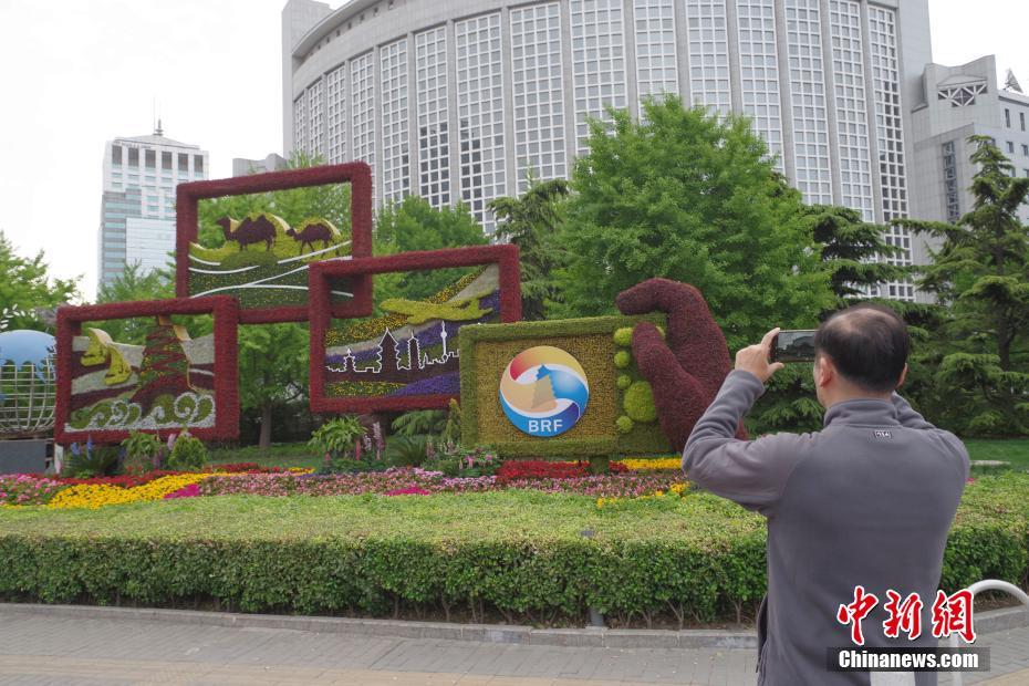 4月18日,北京朝陽(yáng)門的“一帶一路”主題花壇吸引市民拍照。第二屆“一帶一路”國(guó)際合作高峰論壇即將在北京舉行,北京市內(nèi)布置了多個(gè)主題花壇迎接盛會(huì)。中新社記者 賈天勇 攝