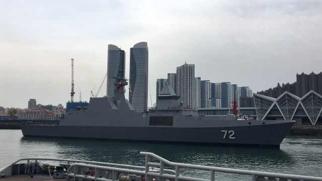 19日10時(shí)許,新加坡海軍“堅(jiān)強(qiáng)”號(hào)護(hù)衛(wèi)艦緩緩駛?cè)肭鄭u大港碼頭。這是參加中國人民解放軍海軍成立70周年多國海軍活動(dòng)到訪的第一艘外國海軍艦艇。新華社記者梅世雄 攝