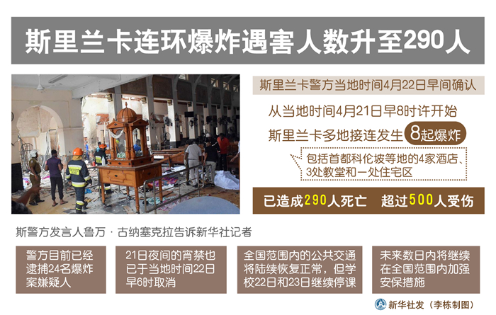 新華社科倫坡4月22日電(記者朱瑞卿 唐璐)斯里蘭卡警方22日早間確認(rèn),該國21日發(fā)生的8起爆炸已造成290人死亡,超過500人受傷。