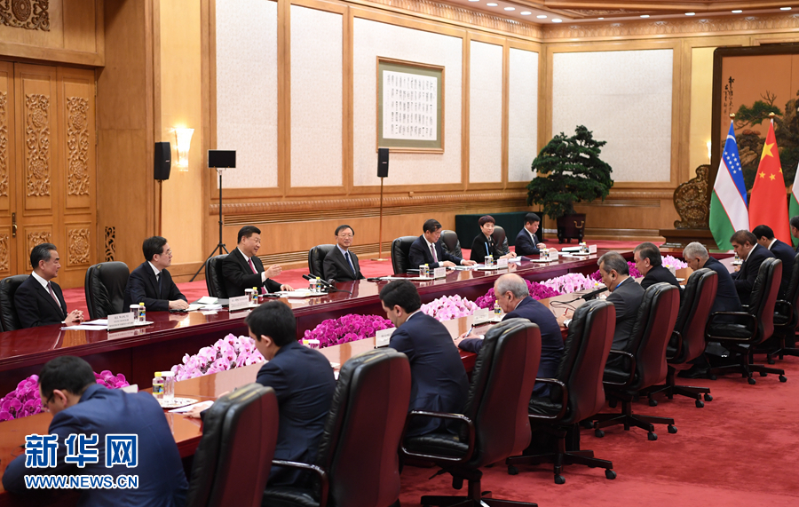 4月25日,國家主席習近平在北京人民大會堂會見烏茲別克斯坦總統(tǒng)米爾濟約耶夫。 新華社記者 殷博古 攝