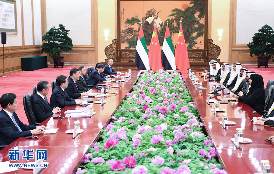 習(xí)近平指出,去年7月我訪問阿聯(lián)酋期間,兩國宣布建立全面戰(zhàn)略伙伴關(guān)系,揭開中阿關(guān)系發(fā)展新篇章。中方視阿聯(lián)酋為共建“一帶一路”的重要合作伙伴。雙方要穩(wěn)步推進(jìn)以能源合作為主軸、以投資和基礎(chǔ)設(shè)施建設(shè)為兩翼、以高新技術(shù)為增長點(diǎn)的務(wù)實(shí)合作。下階段要對接創(chuàng)新發(fā)展戰(zhàn)略,打造兩國合作新增長點(diǎn)。要深化打擊恐怖主義和極端勢力等安全領(lǐng)域合作,共同維護(hù)兩國和地區(qū)安全穩(wěn)定。副總統(tǒng)先生提出的“擁抱中國”計劃深受阿聯(lián)酋民眾歡迎,要不懈推動兩國人文交流。中方支持阿方明年舉辦中東地區(qū)首屆世博會。
