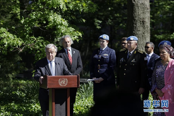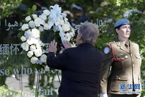 悼念活動上午9時開始,聯(lián)合國秘書長古特雷斯向維和人員紀念碑敬獻花圈并致辭。